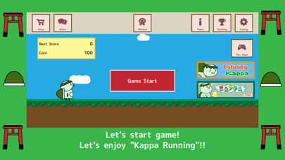 This is a game that Kappa runs, jumps, slids using a shell and aim for goal. Easy operation - Tap the screen to jump! - Tap the screen while jumping to jump double! - Tap the Shell botton to slids using a shell! If you hit an obstacle or fall down it will ge a game over. so let's avoid obstacles. *obstacles - TogeToge - Fire - snake - bird You can get a shell by collecting coins! Performance is different for each color, Let's try some shells and find the best shell. Let's go toward a goal with Kappa!