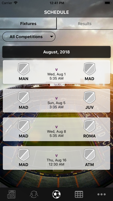 FIXTURES, RESULTS Real Madrid Fixtures is sports live score app with widget that gives you live coverage (results, fixtures, standings) for Real Madrid FC. FEATURES - Multiple views of livescore, fixtures & results: by league or by time. - Multiple types of standings: La Liga table. - Updating NEW league ranking table & standings IMMEDIATELY after the match have FINISHED ! - Transfer News - Breaking News - Very fast and responsive even on slow connection - Bandwidth friendly with our data compression - Lightweight - Free Enjoy application! Sharing application that helps you share articles or with friends. If you are looking for a app on Real Madrid Fixtures, this is the best app for that. So download the app now and enjoy. If you like this app. Please give use five stars, share Google+, Facebook, Twitter, Instergram... and your review. Thank you very much!
