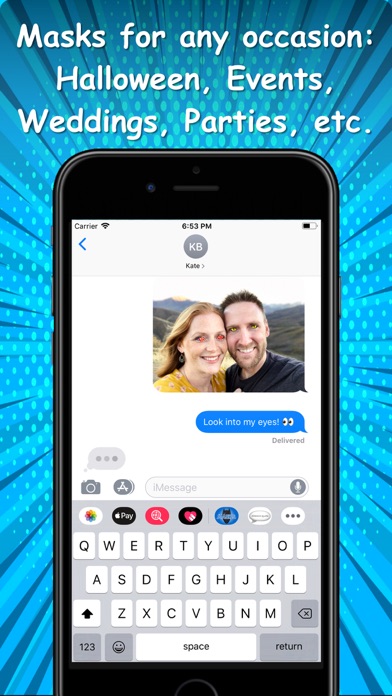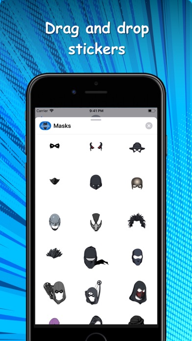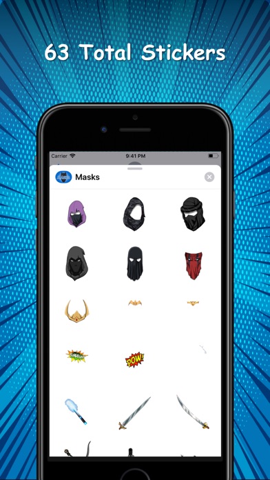 Have you ever wanted to be a comic book hero or villain? Well, now is your chance! With these cool new stickers you can turn an ordinary photo into a comic book page by placing a mask or power on your face or body. Be a Super Hero! Show off your powers! Enjoy finding ways to be creative with the masks. For example, you can use eye blasts, swords, ninja masks. Just add them to your recent selfies or group pictures. Try it out! There are 63 different stickers. If you like this sticker pack, make sure to check out my other sticker apps! Please make sure to leave a review so others know how much you love them. Thanks for downloading.
