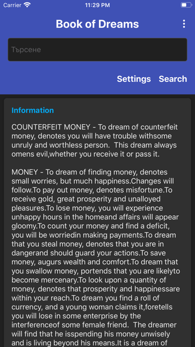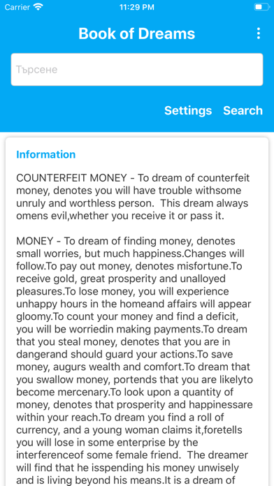 Small app with huge datatbase of dreams. Works completely offline (no need for internet connection). Just write down what you saw in your dream and meaning will be revealed.