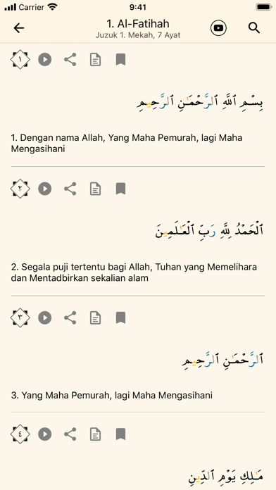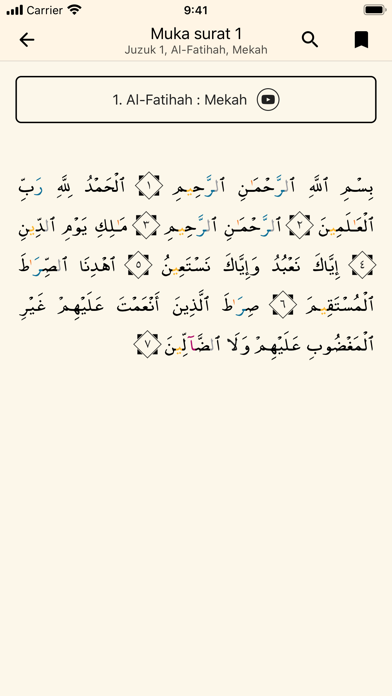 Al Quran tajwid perkata & berwarna (Malaysia Indonesia Brunei Singapura English) Baca, dengar dan fahami Al-Quran dengan Bahasa Malaysia sebagai bantuan rujukan. Anda juga boleh mencatat nota untuk rujukan masa hadapan. Juga boleh kongsi dan lihat nota mengenai Al-Quran yang ditulis oleh orang lain. Ciri-ciri utama ~Audio bacaan per ayat & per kata~ Aplikasi Al-Quran ini membolehkan anda untuk menyemak bacaan Al-Quran dengan bantuan audio. Sentuh pada setiap patah perkataan untuk menyeru keluar audio per kata, atau sentuh pada nombor ayat untuk menyeru keluar audio keseluruhan ayat. ~Tandai bacaan terakhir~ Tandakan bacaan ayat terakhir sebagai rujukan, dan kembali kepada ayat yang ditandai setiap kali membuka aplikasi Al-Quran ini. ~Tajwid berwarna~ Aplikasi Al-Quran ini juga memaparkan tajwid berwarna bagi memudahkan bacaan. Fungsi ini boleh di buka dan di padam pada bila-bila masa. ~Simpan nota~ Fungsi ini membolehkan anda menyimpan nota ringkas untuk rujukan diri sendiri. ~Kongsi ayat~ Teringin untuk berkongsi ayat yang menyentuh hati? Kini anda mampu dengan menyalin pautan dari aplikasi Al-Quran ini dan kongsikan di media sosial.