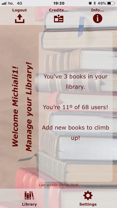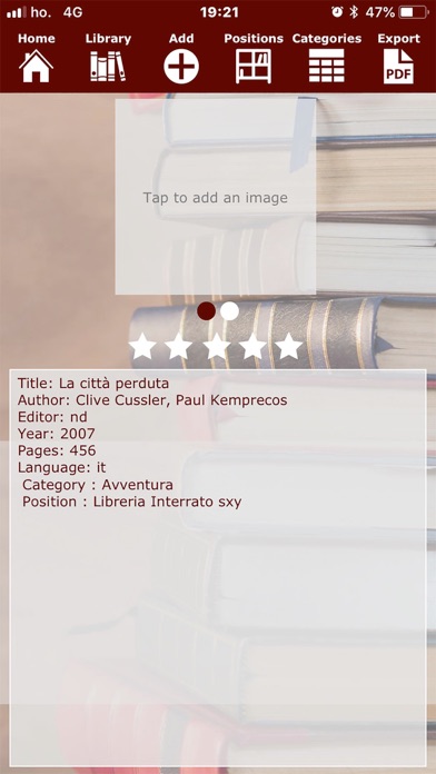 Una semplicissima App per catalogare libri. Necessita di internet per funzionare essendo Cloud-based. Interagisci virtualmente con altri utenti gareggiando a chi ha più libri in catalogo! Oltre al normale inserimento manuale l'Applicazione, sfrutta la fotocamera per effettuare una scansione del codice a barre (ISBN) del libro quindi utilizza il catalogo dei libri di Google per trovare le specifiche del libro e tentare di autocompilarle. L'accuratezza e la continuità del servizio possono variare a seconda del servizio Google e delle variazioni che questo subirà nel tempo. In alternativa sarà presto possibile utilizzare il motore ISBNDB.com mediante la sottoscrizione di un abbonamento a tempo con suddetto servizio (non incluso nell'acquisto della App). È possibile allegare foto alla scheda e dargli una valutazione (da 1 a 5 stelle); inoltre è possibile memorizzare categorie e posizioni (su scaffale, o magazzino) per utilizzi futuri. Con pochi click si effettuano ricerche, ordinamenti, stampe pdf, email...