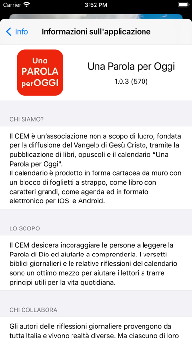 Una parola per oggi è il calendario storico pubblicato ogni anno dalle Edizioni CEM, che illustra e commenta un versetto della Bibbia giorno per giorno. È possibile ascoltare i versi e la breve preghiera del giorno in corso direttamente nell'app come flusso audio. Inoltre, sia il verso che la devozione possono essere condivisi con altri. Tutti gli altri giorni dell'anno possono essere selezionati anche cancellando all'interno dell'applicazione o tramite una finestra di dialogo del calendario.