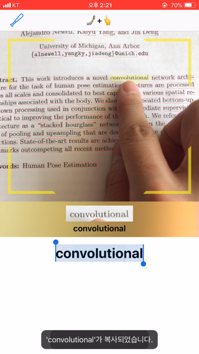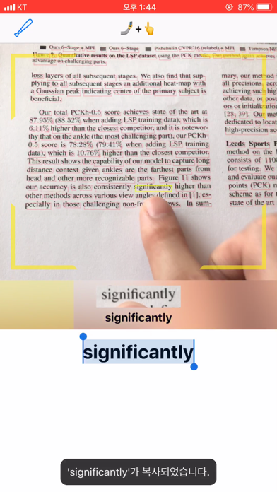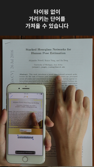 손가락이 짚고있는 단어를 타이핑 없이 가져옵니다! ▶설명 인쇄물의 단어 뜻을 찾기위해 타이핑하느라 지치셨나요? 손가락으로 단어를 짚고 핸드폰을 들고 있는 것만으로 단어를 가져올 수 있습니다. 이 모든 것을 인터넷 연결 없이 가능합니다. ▶주요 기능 - 손가락이 가리키는 단어 인식 - 인식된 단어 자동 복사 - 모든 과정을 인터넷 연결 없이 사용 가능 ▶지원 언어 - (아직은) 영어만 인식 문의: [email protected]