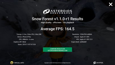 Snow Forest is a gaming class benchmark that showcases the technical capabilities of your mobile device. From the stunning reflections of the snow and the surrounding shadows of the forest to human and insect character animations. Snow Forest contains both a free-roaming Explore Mode and a Benchmark Mode where you can test the performance of your mobile device. The Benchmark Modes allow you to measure the performance of the CPU and GPU of your mobile device: • Metal forward rendering with complex fragment shaders • Dynamic lights and different blending modes • Animation on the CPU • Runs benchmark Onscreen (v-synced) and configure Offscreen in different resolutions • Collects benchmark results and submits them to the asteroidsbenchmarks.com website TECHNICAL FEATURES • Metal API (iOS) • Multi-threaded for multi-core devices • Forward Rendering • C++14 compiled for ARMv8-A • Rendering at native resolution with MSAA • Offscreen Rendering at configurable resolutions • ASTC textures REALISTIC REFLECTIONS AND ANIMATIONS Stunning high-end graphics present themselves across the Snow Forest. Enjoy the reflections in the snow as more is ever-falling from the sky above. There’s a bit of magic in the air with lighting effects coming from the young girl’s wand in hand. See her come to life with real-time animation and watch as she’s joined by several new creatures! BENCHMARK YOUR DEVICE Snow Forest is a visual benchmark based on real-world content. Snow Forest enables performance measurement of mobile devices using CPU and GPU targeted performance metrics. This version has been built with the Universe engine using Metal and multithreading. Benchmark Mode takes a set path through the experience to ensure consistent tests across devices and run-throughs. Once finished the Benchmark Mode displays information about your device and provides performance measurements. ON-SCREEN AND OFF-SCREEN BENCHMARKS While on-screen Benchmark Mode is limited to your device’s native resolution, with off-screen Benchmark Mode you can test performance across a range of resolutions. This makes it easier to compare devices for performance in the same conditions. You can also test how your device would perform if it were to output to a 4k TV for example. MEASURE YOUR PERFORMANCE At the end of the Benchmark Mode, you will be presented with a full report of your device and its performance in Snow Forest Benchmark, which is also uploaded to asteroidsbenchmarks.com. The report contains: • Average FPS (Frames Per Second) • Resolution • Chipset • CPU • GPU GET IN-DEPTH ANALYSIS Snow Forest Benchmark is able to provide in-depth technical performance metrics to give you the data you need to understand how your phone and tablet devices stand up over the course of the benchmark. See detailed charts, lists, rankings and unlock the knowledge you need on our website asteroidsbenchmarks.com: • Frame Rate • Pixel Rate • CPU Rate • Timeline Charts • CPU & GPU Frame Times COMPARE YOUR DEVICE All devices are displayed in the order of performance on our website at asteroidsbenchmarks.com. You’ll be able to compare your device with the other devices ranked. See peak performance and spot performance drops during the timeline of the benchmark for any device. Understand which devices are at the top of their game! ON-SCREEN AND OFF-SCREEN BENCHMARKS While on-screen Benchmark Mode is limited to the native resolution of your device, with off-screen Benchmark Mode you can measure performance rendering at 4K resolution! This makes it easier to compare devices for performance in the same conditions and shows how your device would perform if it were to output to a 4k TV for example. SCORES, DETAILED CHARTS, LISTS, RANKINGS AND MORE All available via the Asteroids Benchmarks website: asteroidsbenchmarks.com