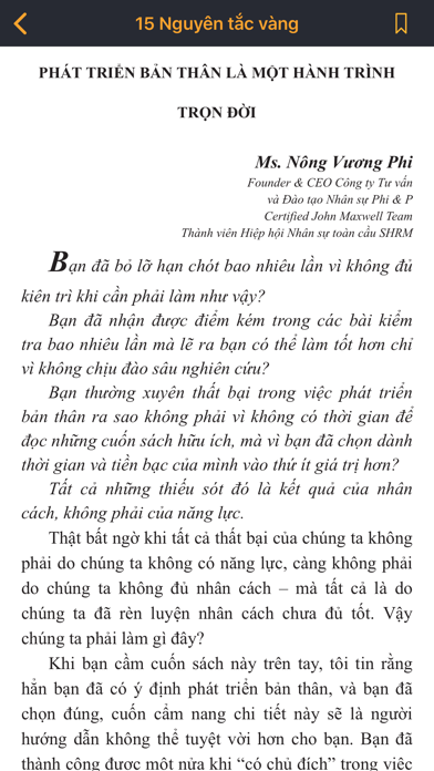 1. GIỚI THIỆU CUỐN SÁCH Qua cuốn sách 15 Nguyên Tắc Vàng Về Phát Triển Bản Thân sẽ dạy bạn đạt tới tiềm năng bằng các nguyên tắc như: + Nguyên tắc Gương soi: Bạn phải nhìn thấy giá trị của bản thân để tăng giá trị cho chính mình + Nguyên tắc Cẩn trọng: Bạn phải hiểu bản thân để tự phát triển + Nguyên tắc Tấm gương: Thật khó để tiến bộ nếu bạn không có ai để học hỏi + Nguyên tắc Dây chun: Bạn ngừng phát triển nếu mất sức căng giữa nơi bạn đang đứng và nơi bạn có thể tới + Nguyên tắc Đóng góp: Phát triển bản thân cho phép bạn phát triển những người khác... Đây là cuốn sách thứ 3 trong series Nguyên tắc của John C. Maxwell (sau 2 cuốn bán chạy là 21 nguyên tắc vàng của nghệ thuật lãnh đạo và 17 nguyên tắc vàng trong làm việc nhóm), sẽ giúp bạn trở thành một người học hỏi không mệt mỏi, với tiềm năng không ngừng tăng lên và không bao giờ bỏ cuộc. 2. CHỨC NĂNG CHÍNH * Đọc sách - Toàn bộ nội dung cuốn sách được chúng tôi tập hợp tại đây và phân thành các danh mục. Bạn sẽ lựa chọn và đọc ngay nhé!!! * Bookmark - Lưu lại vị trí chương mà bạn đang đọc dở để lần sau có thể tiếp tục đọc. * Kho sách - Trong kho sách sẽ giới thiệu tới bạn đọc những cuốn sách liên quan như : + Bí Mật Của Sự May Mắn + Bí Mật Tư Duy Triệu Phú + Bí Quyết Trắng Tay Để Trở Thành Triệu Phú + Dám Nghĩ Lớn + Dám Nghĩ Lớn Để Thành Công + Người Giàu Có Nhất Thành BaBilon + Hẹn Bạn Trên Đỉnh Thành Công + Nhà Đầu Tư Thông Minh + Tự Đào Giếng Trước Khi Chết Khát + ............... Và còn rất nhiều cuốn ebook khác đang được phát triển và dành cho các bạn đọc đón nhận chúng!!!