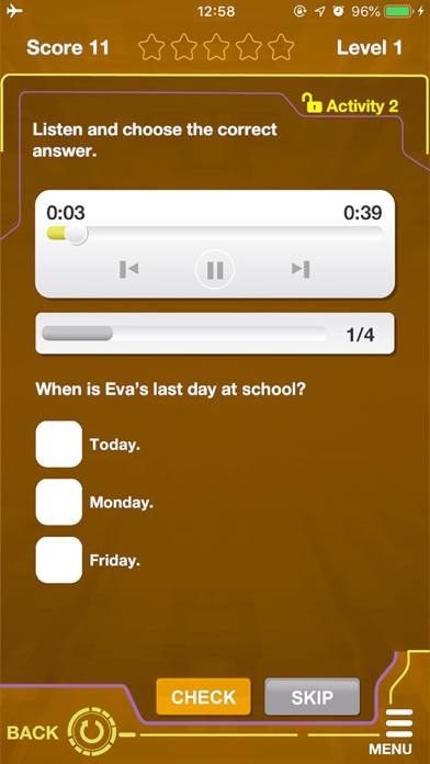 App com atividades extras para todas as unidades, para prática complementar fora da sala de aula em forma de jogo. O acesso é feito com o código disponibilizado no material impresso O aluno fará 6 atividades para cada uma das 8 unidades do material, sendo que a 6ª atividade é um quiz com perguntas trabalhando todo o conteúdo da unidade. Como elemento de gamificação o aluno recebe um número de estrelas de acordo com a sua performance nas atividades. Bloqueio - aluno só passa para a próxima unidade/fase se conquistar 3 das 5 estrelas Troféu - ao final do livro