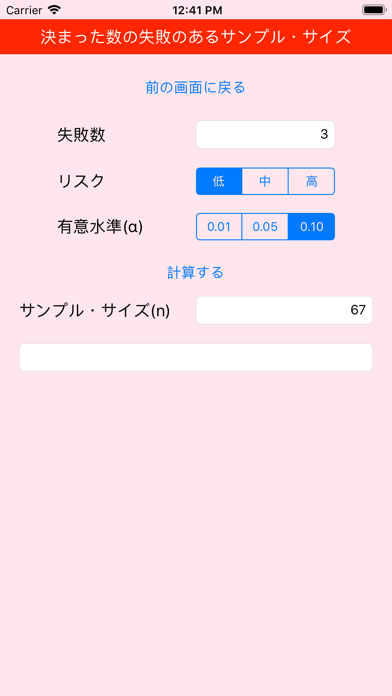 ■ 「有意水準と誤差の範囲でサンプル・サイズ」「失敗のない場合のサンプル・サイズ」「決まった数の失敗のあるサンプル・サイズ」を計算する。 --- ■ 「Γ(ガンマ)関数」「χ(カイ)2乗分布(密度関数)」「χ(カイ)2乗分布表」「製品全てが良品の確率」を計算する付録がある。 --- ■ 「有意水準と誤差の範囲でサンプル・サイズ」では、「誤差の範囲(0.00から0.50の範囲)」と「有意水準(0.01、0.05、0.10のいずれか)」の2つを指定して計算する。 ----- ■ 「失敗のない場合のサンプル・サイズ」では「リスク(「低」「中」「高」のいずれか)」「有意水準」 の2つを指定して計算する。 「リスク」は「FMEAによるリスク計算」等を参考に、リスク・プライオリティ・ナンバー(RPN)を計算する。 監督官庁、監査機関、等が予めRPNとリスクの「低」「中」「高」を結びつけている場合にはそれを採用する。 そうでなければ、自社の品質基準に合わせてRPNとリスクの「低」「中」「高」を対応させておく。 ----- ■ 「決まった数の失敗のあるサンプル・サイズ」では「失敗数」「リスク」「有意水準」の3つを指定して計算する。 「失敗数」とはこの計算で得られるサンプル・サイズの中にどれだけ失敗があるかを指定する。 この計算はχ(カイ)2乗分布を使っている。 この計算では(Johnson, et al. 1994, p. 415-450)で紹介されている近似計算のうち、Extended Wilson-Hilferty法を使っている。 真値との誤差は小さいものの、近似計算であることを了承のこと。 この場合、渡されるパラメータの自由度は4以上なので、下記解説(*)の数表は使っていない。 ----- ■「Γ(ガンマ)関数」では「入力パラメータ(少数点以下第一位が0、または、0.5の正の数)」を指定して計算する。 ----- ■ 「χ(カイ)2乗分布(密度関数)」では「変数」「自由度」の2つのパラメータを指定して計算する。 ----- ■ 「χ(カイ)2乗分布表」では「自由度」を指定して計算する。 この計算で、自由度1、および、2は別途計算した数表から1行を求めている(*)。 自由度3以上は(Johnson, et al. 1994, p. 415-450)で紹介されている近似計算のうち、Extended Wilson-Hilferty法を使っている。 真値との誤差は小さいものの、近似計算であることを了承のこと。 ----- ■ 「製品全てが良品の確率」では「製品数」「欠陥数」「取り出した製品数」の3つのパラメータを指定して全てが良品の確率を計算する。このうち、製品数と欠陥数は母集団パラメータ、取り出した製品数は標本数(サンプル・サイズ)である。 -----
