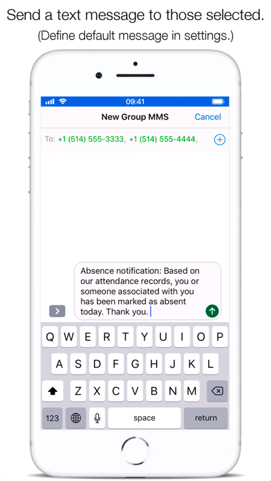Easily create groups, send group emails, send group text messages (SMS) and take attendance. GROUPS ○ Create custom groups (family, class, team...) ○ Add participants or import them from Contacts ○ Assign participants to one or more groups GROUP EMAIL ○ Easily email the entire group ○ Or choose specific participants to email ○ Define custom default message GROUP TEXT MESSAGE (SMS) ○ Easily text message the entire group ○ Or choose specific participants to text message ○ Define custom default message TAKE ATTENDANCE ○ Easily take attendance for today or any other day ○ View history of past attendances ○ Email or text message based on presence or absence ACCOUNT (OPTIONAL) ○ Create a free account to access your data from any device LANGUAGES ○ English ○ French