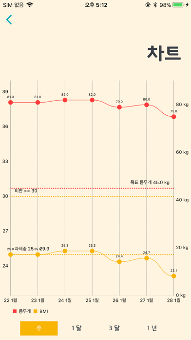 복잡한 기능 없는 체중관리 앱이 여기있습니다. 딱 필요한 기능만 넣었습니다. 바로 다운로드 하여 확인해보세요. 1. 목표설정 2. 입력한 데이터 기반 달력, 차트기능 3. 카메라(눈바디 찍기) 4. 암호잠금(Touch / Face ID) 5. 알림설정 *암호 패스코드, Touch / Face ID 를 지원 합니다. * 목표 목표를 설정하여 체중관리의 동기부여를 만들어 드립니다. 목표일과 목표 체중, 목표 타이틀을 설정하여 앱의 메인에 보여드립니다. 목표를 향해 나가보세요. * 사진찍기 운동을 했는데도 체중의 변화가 없는 경우가 있죠? 운동후, 잠자기전, 샤워 후 매일 전신 사진을 찍어 체중과 같이 비교해보세요. 변화는 반드시 있을거에요~ 찍은 사진은 앱 내에 저장되고 사진 보관함에는 보이지 않습니다. 암호기능이 있어 안전합니다. 물론 저도 못본척 해드립니다. (해당 기능은 인앱 결제가 필요합니다.) * 차트 그래프로 체중과 BMI 의 변화를 한눈에 볼 수 있어 체중관리 계획에 도움을 줄 수 있습니다. * 달력 체중, 상태, 그날의 이벤트, 눈바디를 확인하실 수 있습니다. * 입력 하루를 나타낼 수 있는 이모티콘, 갯수 제한 없는 이벤트 입력 물론 체중만 입력 가능합니다. *수정 날짜를 변경하여 체중값을 변경할 수있습니다. *미리알림 알림을 받을 시간을 설정하고 입력을 잊어버리지 않도록 알림을 설정 합니다. *파운드(lb), 인치(inch) 단위 지원 cm, kg 외에도 lb, inch를 지원하며 입력 후 단위를 변경 시 자동으로 해당 단위로 변경 해 드립니다. *언어 한국어, 영어, 일본어, 중국어(간체)를 현재 지원하고 있으며 설정에서 변경이 가능합니다. *광고제거 죄송합니다. 저희도 광고가 싫습니다. 인앱 결제가 필요하며 한번 구매 하시면 광고 없이 이용 가능합니다.