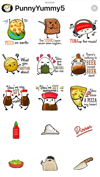 Hooray for Punny Yummy 5! We've got even more elegant and cute puns to fill your chat screens. This pack contains delicious and beautifully drawn food chat stickers to grace your conversations. More fun pun filled foods we've included are: pizza, tuna, truffle, desserts and more! Each sticker is hand drawn and colored to show the exquisite detail of every Punny Yummy character. Add Punny Yummy 5 to your pun sticker collection and let your witty personality come shining through.