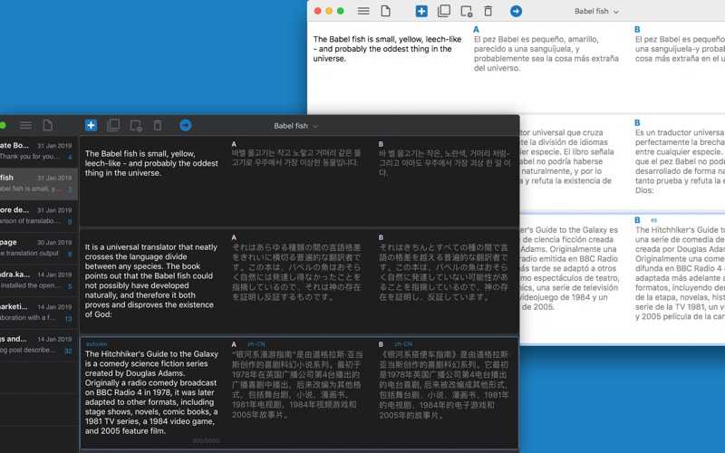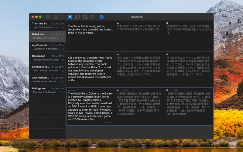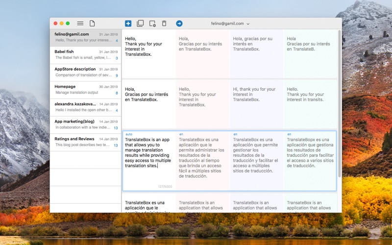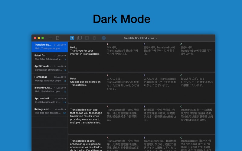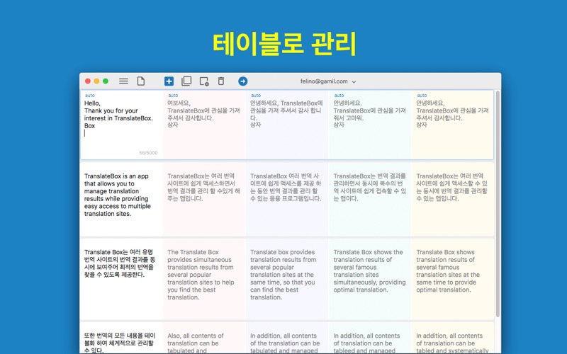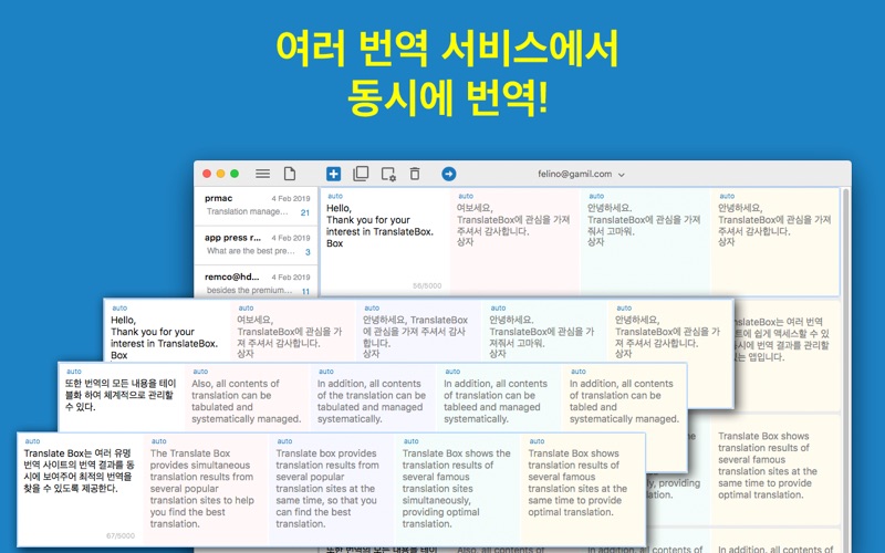 Translate Box는 번역을 비교하고 관리할 수 있는 맥용 앱입니다. 여러 번역 서비스의 번역 결과를 동시에 보여주어 최적의 번역을 확인할 수 있도록 도와줍니다. 또한 모든 번역 내용은 테이블 모양의 문서로 저장되어 번역을 체계적으로 할 수 있습니다. • 번역 서비스 비교 최적의 번역을 얻기 위해서 여러 번역 서비스의 결과를 보여줍니다. 최대 4개의 번역 서비스를 동시에 사용할 수 있습니다. • 테이블로 구성된 문서에서 번역 관리 모든 번역을 테이블로 관리하기 때문에 기존 번역의 삭제 없이 테이블을 확장시키면서 번역의 모든 내용을 유지 관리할 수 있습니다. • 이슈별 번역 관리 이슈별로 문서를 나누어 번역을 일관되게 관리할 수 있습니다. 예를 들어 각각의 이메일 대응에 필요한 번역을 각각의 문서에서 관리할 수 있고, 블로그 작성에 필요한 번역을 또 다른 문서에서 관리할 수 있습니다. • 언어가 자동으로 선택 원어와 주로 사용하는 외국어를 지정해 놓으면 입력하는 언어에 따라서 자동으로 원어와 외국어가 선택되어 번역됩니다. • 동시에 여러 언어로 번역 여러 번역 서비스를 이용해서 번역을 얻을 수 있기 때문에, 각각의 서비스의 언어를 다르게 설정하면 여러 언어로의 번역을 한번에 할 수 있습니다. 새로운 박스를 추가해서 새로운 번역을 추가할 수 있고, 박스를 추가하거나 제거하면서 번역 서비스를 추가하거나 사용중인 번역 서비스를 뺄 수 있습니다. 번역하는 과정이 마치 문서를 작성하듯이 이슈 나 주제별로 문서를 관리할 수 있습니다. ** 제공하는 번역 서비스는 서비스 상황에 따라 변경될 수 있습니다.
