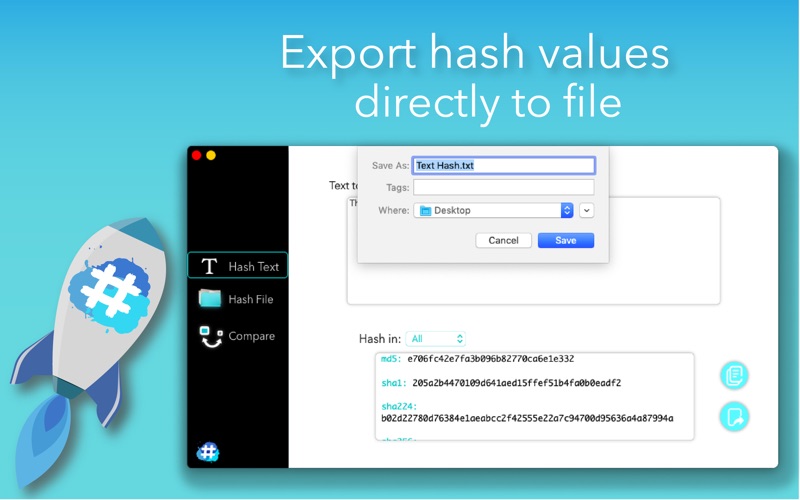 Hash either text or files with any of the following algorithms: o md5 o sha1 o sha224 o sha256 o sha384 o sha512 Even compute them all at once! Export resulting hash string in file and quickly save it to disk or copy it to clipboard with a single click! Compare files to check for similarities or to detect if changes to original file have been made. o Compare file vs file o Compare file vs hash string