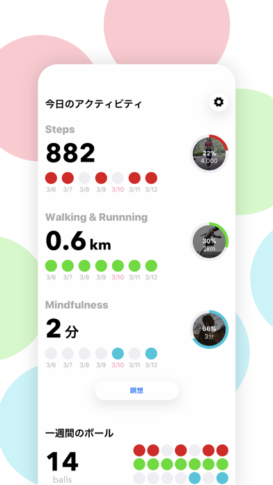 ポップでシンプルなデザインのアプリで、健康的に活動を続けよう。 1日の目標を達成してボールを集めましょう。 このアプリはヘルスケアのデータへアクセスします。 データは安全に処理され、勝手に送信されたりどこかへ保存をすることはありません。