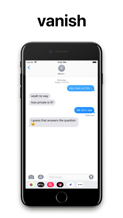 Spill is an iMessage app that lets you send texts in a more private way. Spill is installed right into your iMessage app and can be used in just a few taps: - Open the app inside of your conversation - Write your Spill message - Select an alternate message to be displayed in the conversation - Hit send Spill offers a more private way to send and receive messages: - Messages are end to end encrypted so only the sender and recipient can read the message - In the conversation, Spill messages cannot be read - Messages can only be read once by the recipient - Messages are deleted from the conversation shortly after being read - Messages cannot be copied or screenshotted, making them almost impossible to save - As far as we know your message has no sender or recipient, making your messaging experience completely anonymous Why use Spill instead of other messaging apps? Spill is built right into your iMessage experience so that you can seamlessly continue to send text messages with added privacy. That means no more sending a text and switching to another app to securely share that extra detail. Instead, just open Spill and slip that private message right into the conversation!