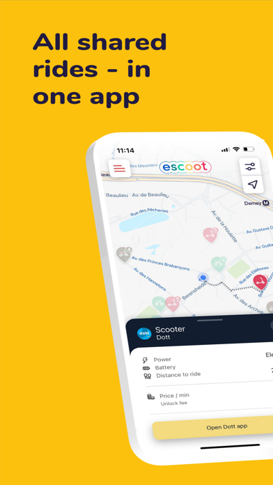 eScoot brings all electric scooters, bikes, cars, and mopeds from different mobility operators together in one simple app! Find the closest ride near you from Lime, Voi, Dott, and many more, without wasting time searching. Let eScoot do the work so you can enjoy the ride! Why choose eScoot? • Fast and effortless: Skip traffic jams and the hassle of scheduled transport. • Eco-friendly: Electric scooters, bikes, cars, and mopeds are good for the planet. • All in one: Access 300+ mobility operators worldwide in a single app. Getting around has never been easier. Just open eScoot, pick your ride, and get moving, simple, fun, and convenient. Want more features or have suggestions? Reach out to us at [email protected]. Partnership inquiries: [email protected] Thanks for choosing eScoot, your all-in-one electric shared mobility app. Download now, it’s free and easy! Terms of Use: https://www.apple.com/legal/internet-services/itunes/dev/stdeula/