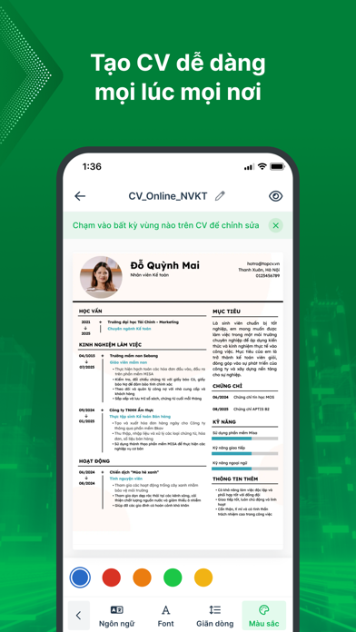 Ứng dụng TOPCV - Tạo CV online chuyên nghiệp, tìm việc làm nhanh, kết nối nhà tuyển dụng uy tín. TOPCV giúp ứng viên tạo CV online chuyên nghiệp chỉ trong vài phút, tiếp cận hàng chục nghìn việc làm hấp dẫn từ doanh nghiệp uy tín. Tải ngay để khám phá hàng nghìn việc làm mới hôm nay! LỢI THẾ VỀ CƠ HỘI NGHỀ NGHIỆP • 60.000+ việc làm chất lượng cao được cập nhật mỗi ngày. • Đánh giá mức độ phù hợp và cạnh tranh với công việc ứng tuyển bằng công nghệ AI • Tìm việc làm hiệu quả với bộ lọc đa dạng: Từ khóa, ngành nghề, mức lương, cấp bậc, vị trí địa lý,... • Ứng tuyển nhanh chóng và dễ dàng theo dõi hành trình ứng tuyển. LỢI THẾ CÔNG CỤ TẠO CV CHUYÊN NGHIỆP • 50+ mẫu CV thiết kế mới nhất đa dạng các phong cách gồm: Đơn giản, chuyên nghiệp, hiện đại, ấn tượng, Havard, ATS,... • 100+ mẫu CV xin việc theo vị trí ứng tuyển các ngành nghề: Kinh doanh bán hàng, Nhân sự/Hành chính/Pháp chế, Kế toán/Kiểm toán/Thuế, Marketing/PR/Quảng cáo, Chăm sóc khách hàng, Công nghệ thông tin,... • Công cụ tạo CV liên tục tối ưu và bổ sung các tiện ích mới, giúp bạn dễ dàng tạo CV ứng tuyển chuyên nghiệp, ấn tượng với Nhà tuyển dụng (NTD) LỢI THẾ VỀ CÔNG NGHỆ VỚI CÁC TÍNH NĂNG HỮU ÍCH • Bộ công cụ cần thiết và hữu ích cho mọi người lao động: Tính lương Gross - Net, tính thuế thu nhập cá nhân, tính Bảo hiểm thất nghiệp, tính BHXH 1 lần, tính lãi suất kép, lập kế hoạch tiết kiệm,... • Bộ công cụ khám phá bản thân: Trắc nghiệm tính cách MBTI, trắc nghiệm MI,... TopCV tin rằng, mỗi chúng ta sinh ra đã là một phiên bản độc đáo của riêng mình với những thế mạnh riêng biệt. Khi nội lực tự thân được hội tụ cùng ngoại lực vững mạnh thì đó chính là lúc thành công được nâng tầm lên một chuẩn mới. Trong nghiệp, mỗi UV đều xứng đáng có những cơ hội để thể hiện tiềm năng năng và mỗi NTD sẽ luôn chào đón những nhân tài. Thấu hiểu điều đó, TopCV luôn khao khát kiến tạo một một cầu nối có giá trị bền vững, để mỗi kết nối là “đúng người, đúng thời, đúng hướng” - cùng nhau trao cơ hội, tiếp sức thăng hoa. Đây chính là động lực để TopCV tiên phong trong lĩnh vực HR Tech và ứng dụng công nghệ vào mọi giải pháp nhân sự. Với hệ sinh thái đa nền tảng, TopCV kỳ vọng biến sức mạnh của công nghệ thành lợi thế dành riêng cho mỗi UV và từng doanh nghiệp. Từ đó, lợi thế tiếp lợi thế, thành công nối thành công. TopCV - Tiếp lợi thế, nối thành công!