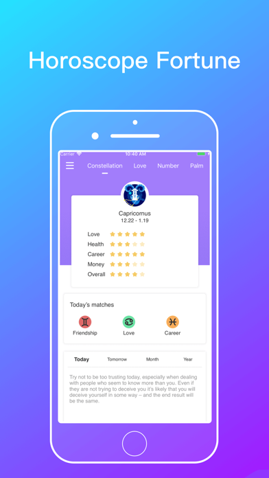Big Zodiac, many users like it! Do you want to know the love index of yourself and your favorite people? Do you want to know your wealth through mysterious astrology? Do you want to know the anecdotes that happen every day? Do you want to know your lucky number? Fortune analysis, constellation matching, Big Zodiac helps you avoid evil! 【feature】 Love and family, career development, to provide you with professional forecasting services. When you doubt and hesitate, provide you with a decisive reference. The constellation Tarot brings you into the ancient mysterious and interesting astrology world. Palm analysis, life line, head line and heart line analysis. Subscription pricing and terms: For unlocking all features and content, Premium Membership offers two auto-renewable subscription options: - $6.99/week, the first three days of subscription are free. - $90.99/year, the first three days of subscription are free. End of trial and subscription renewal: - Payment will be charged to iTunes Account at confirmation of purchases. - Subscription automatically renews unless auto-renew is turned off at least 24 hours before the end of the current period. -Account will be charged for renewal within 24-hours prior to the end of the current period, and identify the cost of the renewal. -Subscriptions may be managed by the user and auto-renewal may be turned off by going to the user’s Account Settings after purchase. -Any unused portion of a free trial period, if offered, will be forfeited when the user purchases a subscription to that publication, where applicable. -Privacy Policy http://www.bigzodiac.club/bigzodiac/privacyPolicy -Terms of use Http://www.bigzodiac.club/bigzodiac/termsofuse