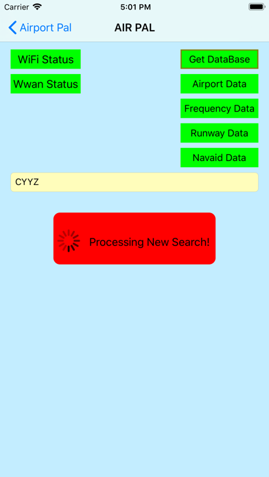 The app downloads current database information from the internet and saves it on your device so you can search airports while out of range of cell phone service, The search engine provides current details of runways and communication frequencies, including AWOS and ATIS, if available. You can search by airport name, location or any simple text which is relevant. For example, use a search for "CYYZ" as an identification, or "Lester B. Pearson" as a name, or just "Pearson" which will find several airports. All airports found will show as a table and you can select the one of interest to take you to the detail screen. Here you will see the airport name, elevation, latitude and longitude, all runways and all communication frequencies broken out by function such as: ARR. DEP, ATIS, GND, TWR, MF, etc.). This is designed as a convenient pilot aid not as a substitute for formal documents in flight planning.