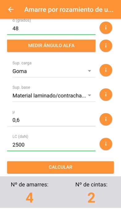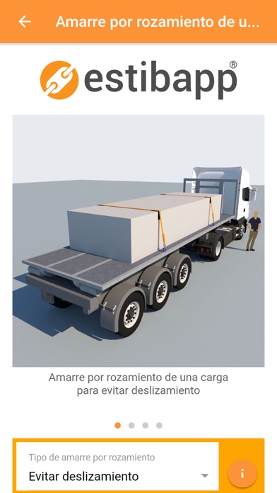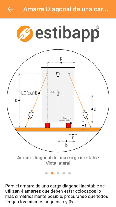 Estibapp calcula con rigurosidad y seguridad, de acuerdo a la Ley 31/1995 de Prevención de Riesgos Laborales, R.D. 563/2017, el número de amarres o el valor de LC(daN) óptimos para la sujeción de una carga en transporte por carretera. Los tipos de amarre que calcula Estibapp son: - Amarre por rozamiento para evitar Desplazamiento-Balanceo. - Amarre diagonal de una carga. - Amarre diagonal de una carga bloqueada. - Amarre diagonal de una carga inestable. - Amarre inclinado longitudinal y transversal. - Amarre en bucle cuadrado y cilíndrico. - Amarre de una bobina. - Amarre de maquinaria fija. - Amarre de maquinaria móvil. Estibapp permite medir directamente los ángulos alfa y beta necesarios para realizar los cálculos. Para medir los ángulos beta con el dispositivo, éste debe disponer del sensor Giroscopio. Si no cuenta con él, no se puede medir el ángulo beta directamente, pero se puede introducir a mano.