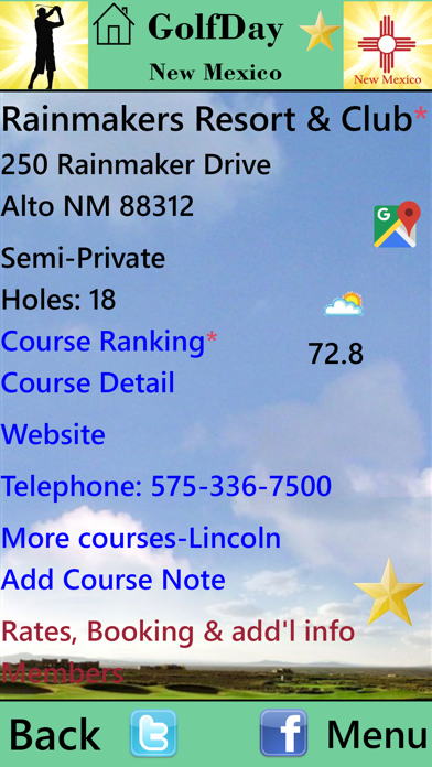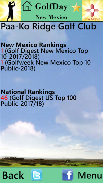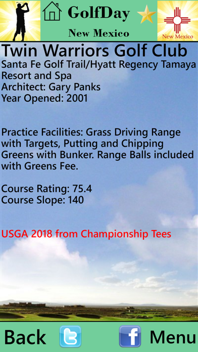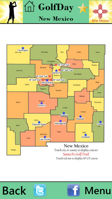 Price: $.99 ***NEVER ANY POP-UP ADS*** Golf Course Reference and Location Guide More than 75 golf courses in New Mexico • Course Name and Address • Designation (Public/Private/Resort) • Course Rankings (Golf Digest/Golf.com/Golfweek/Dallas Morning News) • USGA Course and Slope Ratings • Course Architect(s) and Year Opened • Practice Facility Detail (Range-Grass or Mats, Targets, Short Game) • Booking links (Direct to on-line course site for best rates and availability without booking fees) • Link to Golf Course Web Site • Additional Links for Photos, Course Description, Layout, Score Card, Video and Specials (Public Courses) • Mapping and Directions to each course • Local weather conditions for each course • Member Login (Private and Semi-private courses) • Telephone Number (with auto-dial) • Course locator: Search by -GPS Proximity to where you are or where you are going -City or zip code -Course Ranking with proximity • Save Courses to “favorites” • Make Course Notes with auto email or text • Regular updates to keep your App current Start getting more course for your buck. GolfDay provides everything you need to find the course you want to play at the best rate--right at your fingertips. WHAT'S NEW More Courses, more rankings and more detail. The most accurate Golf Course information available.