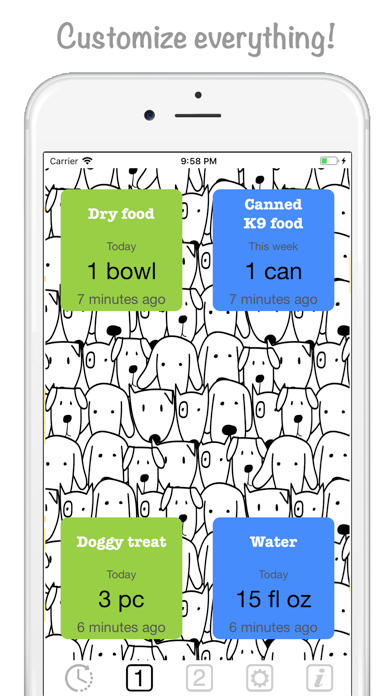 When did I last give Max his medicine? When was his last walk, and how long did we walk? Did he get his medication today? How much, and what did he eat yesterday? Did he drink enough this week? Take care of these questions with this handy app! Among other unlimited possibilities: - tracks your walks - tracks your dog's exercise - tracks your dog's food intake - tracks your dog's medicines - tracks your dog's water intake - tracks multiple dogs You can track anything you want, this app is total freedom. You decide what to track. This app is 100% customizable! Change the colors, the font the color of your font, really anything! A must have for dog owners!