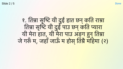 Nepali Christian Songs Offline app is an offline electronic version of Nepali Christian songs. Features:- - Offline Nepali Christian Songs Book - 2181 Total songs - 1151 Nepali Songs - 1030 English Songs - 86 Video Songs - 2181 PPT and PDF songs - Stunningly beautiful graphics - Intuitive and easy-to-use interface - Plenty of themes - Favorites - Slide Show option - iPad Support - Remote Slideshow - Video Songs added - Recent Songs - Song search made easy by Unicode Nepali font - Ads can be removed by the one time purchase - Song scale, beat and tempo for some songs - Export any song as PPT/PDF - And many more tweaks inside the app