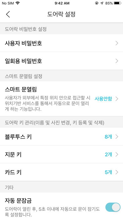 “당신의 세상을 지키다, 게이트맨” 대한민국 1위 디지털도어록 게이트맨의 ‘Smart Living’ 서비스로 일상생활에서 혁신을 맞이해보세요. 이제 열쇠도, 비밀번호도, 카드도 필요 없이 스마트폰으로 도어록을 열 수 있습니다. 본 서비스는 새 열쇠 없이 게이트맨 도어록의 잠금, 열림 기능은 물론, 비밀번호 변경 등 도어록의 각종 설정 변경 및 출입이력까지 스마트폰에서 모두 쉽게 확인이 가능한 게이트맨만의 신개념 서비스입니다. ◆ 위치기반 스마트키 • 나만 알아보고, 나에게만 자동으로 열리는 스마트 도어락 • 외출 후 도어락 근처에 다가가면 도어락이 사용자를 식별하여 자동으로 열립니다. - GPS로 사용자의 위치를 분석하여 귀가 시 1회 자동 문 열림 실행 - 위치기반 스마트키 기능은 설정을 통해 활성화/비활성화 가능 - 위치기반 스마트키 기능은 스마트리빙이 지원되는 제품에서만 지원 ◆ 스마트 귀가 알림 • 우리 가족이 안전하게 귀가했는지 실시간으로 알림을 받을 수 있습니다. • 비밀번호, 지문, 카드, 스마트폰 등으로 인증 했을 때 실시간으로 푸시 알림이 전송됩니다. - 지문, 카드키, 스마트폰은 등록된 사용자가 각각 다르기 때문에 명확한 사용자 식별이 가능 - 내부 문 열림에 대한 알림 여부는 설정 가능 ◆ 방문자 맞춤형 비밀번호 설정 • 내가 없는 동안에도 방문자에게 임시 비밀번호를 안전하게 제공할 수 있습니다 • 한 번만 사용 가능한 일회용 비밀번호, 방문자 특성에 맞게 시간 설정이 가능한 비밀번호가 지원됩니다. - 일회용 비밀번호: 방문자에게 일회성으로 사용 가능하도록 설정 가능 - 방문자 비밀번호: 방문자에게 특정 시간대에 사용 가능하도록 설정 가능 - 마스터 모드 설정 시 시간 설정이 가능한 30개의 비밀번호 설정 가능 - 비밀번호 생성 후 카톡이나 문제 메시지를 통해 사용자에게 발급 가능 ◆ 간편한 도어락 설정 • 도어락의 다양한 기능을 복잡한 조작 과정 없이 앱을 통해 설정이 가능합니다 • 스마트리빙3.0 앱으로 스마트 도어락을 연결하여 설정할 수 있습니다 - 다양한 도어락 비밀번호 설정 (사용자 비밀번호, 방문자 비밀번호, 일회용 비밀번호) - 복잡한 과정없이 다양한 인증키 등록 및 관리 (블루투스, 지문, 카드, 반도체) - 스마트 문 열림 설정 - 자동 문 잠금 설정 - 문을 열고 나올 때 알림 받기 설정 - 도어락 음성언어 설정 - 도어락 음량 설정 ◆ 원격 열림/닫힘 • 예상치 못한 손님이 왔을 때, 비밀번호를 알려 줄 필요없이 외부에서 원격으로 문을 열 수 있습니다 • 스마트리빙3.0 앱으로 스마트 도어락을 연결하여 설정할 수 있습니다 - 집 내부에서는 블루투스 연결하여 사용 - 외부에서는 네트워크 연결하여 브릿지를 통해서 사용 ◆ 우리가족 출입 이력조회 • 우리가족의 출입 이력을 확인해보세요 • 도어락에서 사용하는 모든 인증 수단으로 인증한 모든 정보의 이력 조회가 가능합니다. - 날짜 별로 조회 가능 - 전체, 출입 , 경보, 등록 이력을 필터링하여 조회 가능 - 키워드 검색으로 정렬하여 조회 가능 ◆ 펌웨어 업그레이드 • 우리 집 도어락을 언제나 최신으로 사용할 수 있습니다 • 스마트리빙 앱을 통하여 도어락 시스템을 간편하게 업데이트 할 수 있습니다. - 스마트 도어락, 블루투스 통신팩을 앱을 통해서 업데이트 가능 - 브릿지 펌웨어는 자동 업데이트 제공 ◆ 스마트리빙3.0에서 업그레이드 된 새로운 기능 • 자동 문 열림 기능 • 도어락 비밀번호 및 모든 인증키(지문, 카드, 반도체) 시간관리 기능 • 도어락 펌웨어 업데이트 기능 • 현관문 자체의 열림/닫힘 식별 가능 • 브릿지 하나로 여러 개의 스마트도어락 및 스마트락 연결 가능 • 스마트폰 하나로 스마트도어락 및 스마트락 무제한 연결 가능 ※ 상세 설명서 “게이트맨 블루투스” 어플리케이션에서 상세 설명서를 확인하세요. ※ 요구사양 (Bluetooth 4.0 지원) ■ 아이폰 : iPhone 5 이상 / iOS 8.0 이상 ■ 호환되지 않는 모바일 기기를 사용하실 경우, 사용이 원활하지 않을 수 있습니다. ■ 도어락 : 게이트맨 스마트리빙 지원 도어록 (스마트리빙 지원 모델은 홈페이지 참조) ■ 블루투스 통신팩 : 별도 구매(고객센터 1544-3232 또는 대리점 1577-1919) 언제나 편리하게 안심을 제공하는 게이트맨입니다. 감사합니다. ---- 개발자 연락처 : 서울시 금천구 가산디지털 1로 186 제품플라츠빌딩 10층 아사아블로이㈜아이레보 (iRevo-ASSA ABLOY Korea, 10F of JEI PLATZ Bldg., 186, Gasandigital-ro, Geumcheon-gu, Seoul, 08502, Korea) 서비스 센터 - 1544-3232