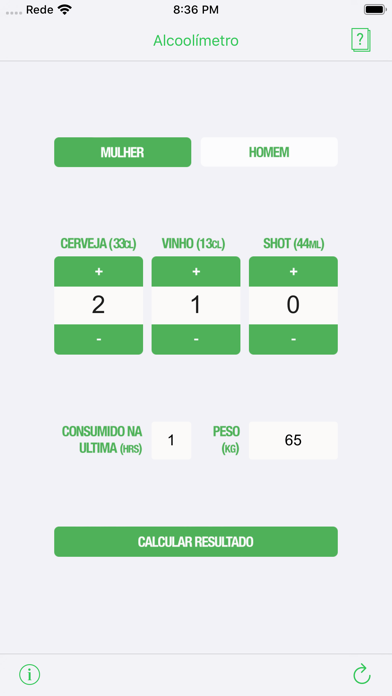 Alcoolimetro Digital (BAC) Importante: Esta aplicação é referenciada apenas para países cujo limite da taxa de álcool é de 0,50!!! Verifique cuidadosamente qual a taxa limite permitida no país que se encontra ou que deseja referenciar! Os resultados apresentados nesta aplicação são calculados através de uma fórmula matemática. O real TAS (teor de álcool no sangue) depende do metabolismo de cada indivíduo. Use esses resultados apenas como referência.