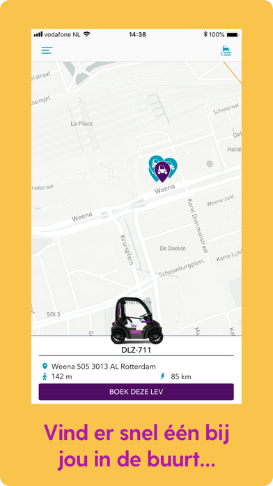 Rij elektrisch met Lev. Krijg direct toegang tot comfortabele en leuke elektrische wagens die vrij in onze Thuis Zone in Rotterdam te vinden zijn. Je bent niet langer afhankelijk van ja auto voor korte ritten door de stad of van een scooter die je niet beschermt tegen de elementen. Lev’s gesloten cabine biedt dezelfde bescherming als een auto, met meer flexibiliteit. Er is genoeg ruimte om een passagier mee te nemen en ze zijn makkelijk te parkeren dankzij hun maat. En de parkeerkosten? Die betalen wij. Hoe het werkt: 1. Download the app 2. Maak een account 3. Vind je Lev 4. Haal de Lev in de app van het slot 5. Go your way Ben je op je bestemming aangekomen? Parkeer Lev en hij is klaar voor de volgende gebruiker. De voordelen van rijden met Lev: Comfort: Reis comfortabel met twee personen of neem spullen mee. Het dak houdt je beschut tegen regen of wind. Gemak: Vind, boek en ontgrendel een Lev met de app en ga op weg. Parkeren doe je gratis en gemakkelijk bij je bestemming. Goed voor de stad: Elke elektrische Lev rit draagt bij aan een stad met schonere lucht en meer ruimte voor iedereen. Servicegebied Lev is voor gebruik in de stad. In de app zie je waar beschikbare Lev’s staan. We bedienen nu grote delen van Rotterdam die zijn aangegeven met gele lijnen. Je kan de rit alleen afsluiten binnen het Servicegebied. Heb je vragen? Stuur ons dan een e-mail op [email protected] of via +31 (10) 300 6536 Volg ons op Twitter (@getlev_NL), Instagram (@getlev_nl) of Facebook (@getlev). Go Your Way. Go Lev.