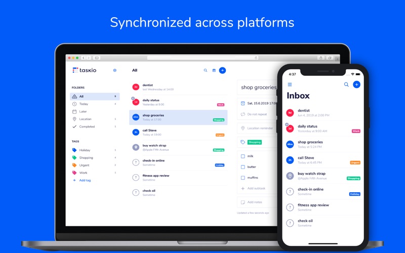 Used everyday in more than 120 countries around the world. "Taskio comes awfully close to being next great to-do app." - MacLife Smart and simple task management for everyday life designed to help you complete your tasks with ease. Taskio comes with intuitive gestures, beautiful design and is powered by a lot of professional features. KEY FEATURES: - Reminders with smart date recognition - Recurrence - Location based reminders - Subtasks - Tags (lists) support - Seamless cloud synchronization - Dark mode - 10+ color themes and Dark Mode MORE DETAILS: - Reminders - Get reminded on your tasks with reminders that can be fined tuned to your needs. - Recurrence - Repeating tasks? No problem, we've got you covered. - Location based reminders - Get reminded on your tasks at specific location. Pick a location from map or enter street address. Reminders is the fired on your iPhone. - Subtasks - A list of subtasks which can be completed separately. Perfect for shopping lists! - Tags (lists) support - Tasks assigned to tags. Helps you find your way. - Seamless cloud sync - We'll backup your tasks at safe place. You can come back to them any time you want. - 10+ Color Themes Taskio is free to download and use. Taskio Premium gives you unlimited access to Recurrence, Location Reminders, Subtasks and Tags to help you be more productive than ever for $0.99 a month, $9.99 a year through a non-renewable subscription or for $19.99 for lifetime (as one-time purchase). Taskio Premium subscriptions will be charged to your credit card through your iTunes account. You will not be able to cancel a subscription during the active period. You can manage your subscriptions in your iTunes account settings after purchase. Terms of service: http://taskio.app/terms-of-service Privacy Policy: http://taskio.app/privacy-policy