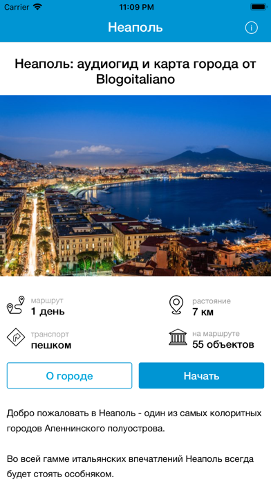 Аудиогид «Неаполь: Путеводитель и карта» – это готовая и удобная аудио экскурсия по историческому центру столицы Кампании, которая поможет Вам узнать гораздо больше, чем успевает 95% путешественников, и при этом значительно сэкономить на услугах живых гидов. Маршрут начинается у Национального археологического музея Неаполя, куда можно добраться с помощью метро до станции Музей (Museo), а завершается на вершине холма Вомеро, откуда открывается захватывающая панорама на город и вулкан Везувий. Во время экскурсии Вы увидите все главные достопримечательности Неаполя, включая кафедральный собор Святого Януария, капеллу Сан-Северо, галерею Умберто I, театр Сан-Карло, Королевский дворец, замки Кастель Нуово, Кастель-дель-Ово и Сант-Эльмо. Всего на карте аудио экскурсии отмечено 55 объектов, объединенных в единый маршрут протяженностью около 7 км. Каждый пункт экскурсии состоит из рассказа о достопримечательности, озвученного профессиональным диктором, фотографии и текстового описания. Для большего удобства все пункты аудиогида нанесены на встроенную карту Неаполя и пронумерованы в той последовательности, в которой их наиболее удобно исследовать. Аудиогид не расходует мобильный трафик в роуминге и может работать без подключения к интернету, а встроенная GPS навигация позволит легко отыскать правильный путь в лабиринте улочек и площадей Неаполя, даже если Вы в городе впервые. Прохождение полного маршрута, в зависимости от посещения музеев и достопримечательностей, займет у Вас от нескольких часов до полного дня. При необходимости Вы можете в любой момент поставить экскурсию на паузу, отойти от маршрута и вернуться к нему позже в любой из 55 точек. Первые несколько пунктов экскурсии можно прослушать бесплатно, но для открытия доступа ко всему маршруту приобретите полную версию. Она обойдется в десятки раз дешевле индивидуальных экскурсоводов и сэкономит 120-180 Евро по сравнению с услугами живых гидов. Установите аудиогид «Неаполь: Путеводитель и карта» прямо сейчас, протестируйте бесплатную пробную версию и получите всего по цене 1 коктейля пошаговый план на целый день в одном из самых колоритных городов Италии.
