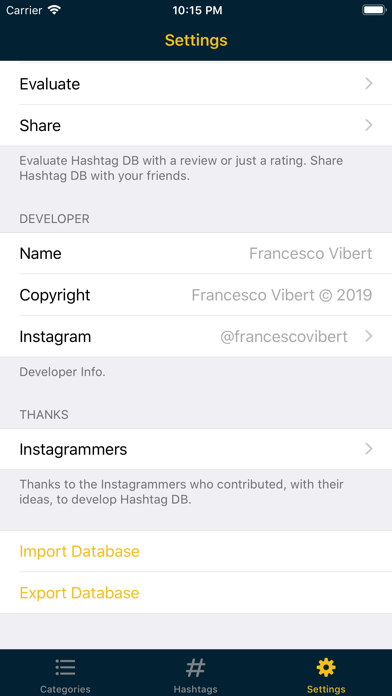Smartly create your customized hashtag database. When you have finished creating your hashtag categories, copy them with a simple swipe! Import the database of other users using Hashtag DB. Open the hashtags directly on Instagram with a simple swipe on it.