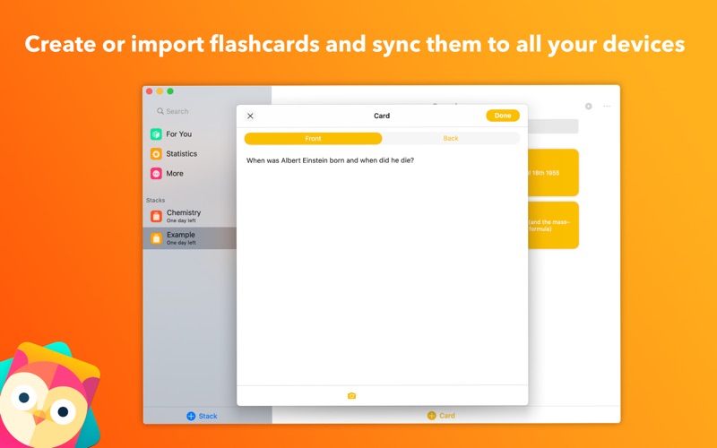 ++ Flippy is part of Apple's favorite apps in July 2019 ++ Did you know, that you forget 40% of the stuff you learned after one hour? Or, did you know, that you only remember 30% of your lecture after one day? With Flippy these times are over. Flippy is a flashcard app that uses smart algorithms and modern technology like ARKit to improve learning. This way you can master every exam or just learn for life better. KEY FEATURES: • Generated sessions just for you. Tap and start - no need to choose your cards. • Intuitive interface during each session. Swipe left to mark as unknown, swipe right to mark as known - and tap to see the answer. • Create stacks of flashcards on your devices by taping, drawing, sketching or importing graphics. • Smart reminders, when it’s time, to repeat your cards again. • Algorithm based on the Leitner study system. • Detailed statistics of your progress. • Gamification: Earn points for each known card and compare them with your friends. • iCloud Sync between all devices (requires Premium). This is just the beginning. Like for Planny, the Smart To Do List, there’s a lot in the pipeline for future updates. If you’d like to see a certain feature, let me know using the integrated feedback section. _______________________________________________________________________________________________________________________ The app can be tried for free. To unlock all features, you can get a subscription. A Premium membership unlocks all features, enables access to future updates and supports the development of the app. Note that iCloud features require an iCloud account and iCloud Drive. Privacy policy: http://kevinreutter.de/privacy Terms of use / Conditions: http://kevinreutter.de/privacy
