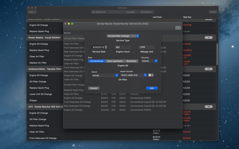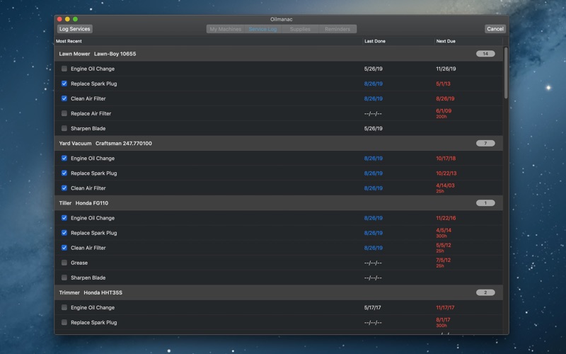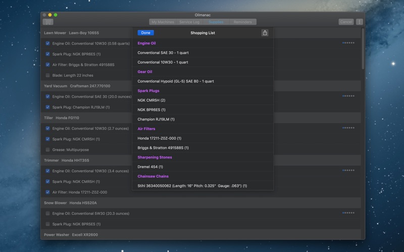 Oilmanac is a maintenance manager and service log for all your machines with small engines. It keeps all your maintenance data in one convenient place - on your Mac. No need to dig out the user manual and page through it every year to perform routine maintenance on your machine. Pull up the machine in Oilmanac, and all the information you need to perform the maintenance is immediately available. Once the maintenance is completed, you can easily record all the services you performed in the Service Log tab. Enter your model specifications and maintenance recommendations for each machine from your user manual, or download them from the user database if available. A wide variety of machine types are available: lawn mowers, lawn edgers, leaf blowers, yard vacuums, weed trimmers, hedge trimmers, tillers, power washers, water pumps, augers, chainsaws, log splitters, generators, snow blowers, outboard motors, personal water craft, all terrain vehicles, and snowmobiles. Available services are tailored to the specific machine, including oil and oil filter change, spark plug change, air filter clean and change, transmission/gear oil change for drivable machines, grease, and others. Additional features: ∙ Automatically download model specifications and maintenance recommendations from the user database ∙ Complete service record for all your machines ∙ Create shopping lists for material needed for service: oil, filters, spark plugs and more ∙ Set reminders when service is due for each machine, or schedule annually ∙ iCloud sync: all your machine data is stored securely in your iCloud account, and is available on all your macOS and iOS devices logged into iCloud - Mac, iPad, and iPhone. (Requires iCloud Drive. Oilmanac for iOS available as separate purchase from the App Store).