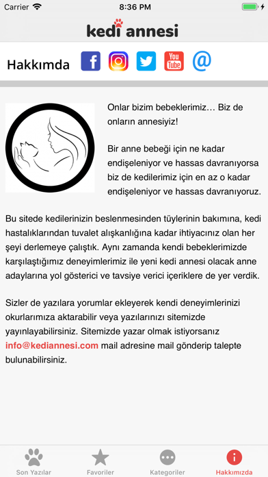 Bir anne bebeği için ne kadar endişeleniyor ve hassas davranıyorsa biz de kedilerimiz için en az o kadar endişeleniyor ve hassas davranıyoruz. Bu uygulamada kedilerinizin beslenmesinden tüylerinin bakımına, kedi hastalıklarından tuvalet alışkanlığına kadar ihtiyacınız olan her şeyi derlemeye çalıştık. Aynı zamanda kendi bebeklerimizde karşılaştığımız deneyimlerimiz ile yeni kedi annesi olacak anne adaylarına yol gösterici ve tavsiye verici içeriklere de yer verdik. Ayrıca kedi cinsleri, cins kedilerin özellikleri ve kedilere ait eğlenceli içerikler de bulunmaktadır. Uygulama sayesinde istediğiniz konuyu arayarak ilgili yazılara ulaşabilir, beğendiğiniz yada faydalı bulduğunuz yazıları favorilerinize ekleyip dilediğiniz zaman onlara hızlıca ulaşabilirsiniz. Aynı zamanda uygulamamız offline çalışma özelliğine sahiptir. Bu özellik beğendiğiniz yazıları internet olmadan okuyabilmenize olanak sağlar. Uygulama üzerinden bizimle iletişime geçerek konu önerisinde bulunabilir, aklınıza takılan sorular hakkında destek alabilirsiniz. Bildirimler sayesinde güncel yazılarımızdan anında haberdar olabilirsiniz.