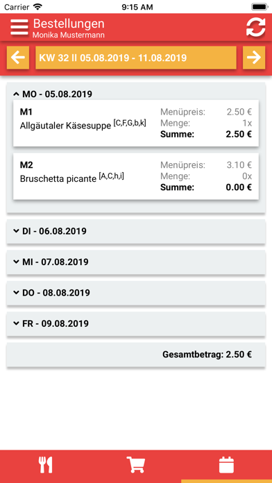 Die angemeldeten Essenteilnehmer der Mahlzeit GmbH sehen ihren täglichen Speiseplan und die farblich hervorgehoben aktuellen Essenbestellungen. Die Anzeige der Menüs im Speiseplan ist in einer täglichen oder wöchentlichen Ansicht möglich und kann in den Einstellungen den individuellen Bedürfnissen angepasst werden. Zu- und Abbestellungen sind bis zum vereinbarten Zeitpunkt möglich. Bestelländerungen werden im Warenkorb abgelegt und bei bestehender Online-Verbindung an das Online-Bestellsystem übergeben. In einer separaten Liste sind alle aktuellen Bestellungen enthalten. Zu jedem Menü können zusätzliche Informationen angezeigt werden: Allergene, Inhaltsstoffe, Zusatzstoffe etc. Individuell ist es in den Einstellungen möglich, für besonders wichtige Allergene, Inhalts- und Zusatzstoffe eine Warnung direkt im Speiseplan festzulegen. Werden mehrere Essenteilnehmer in der App angemeldet, z. B. Geschwisterkinder, kann zwischen deren Speisepläne schnell gewechselt werden. Mahlzeit GmbH