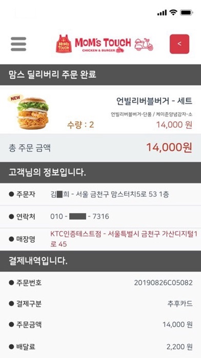 ■ 앱 소개 .맘스터치 딜리버리 어플을 통해 맘스터치만의 정성어린 한 끼 식사를 배달해 드리겠습니다! 1) 맘스오더를 통해 미리 주문하고, 원하는 시간에 따뜻한 제품을 픽업해보세요! 2) 맘스 딜리버리 서비스를 통해 맘스터치 제품을 원하는 곳에서 만나보세요! ■ 주문 시 유의사항 .맘스터치 딜리버리 회원이 아니더라도 비회원으로 인증 후 주문 가능합니다. .모바일 주문은 당일 배달 주문만 가능합니다. .예약 주문은 현재 시간 +30분 이후부터 설정 가능합니다. => 딜리버리 예약 주문은 현재 시간 +1시간 이후부터 설정 가능하며, 오더 예약 주문은 현재 시간 +30분 이후부터 설정 가능합니다.(당일에 한함.) .주문 수량이 많거나 / 단체 주문 시 매장에 미리 전화해 매장상황 확인 부탁드립니다. .주문 관련 오류가 있을 때는 (1661-9162) 맘스터치 딜리버리 콜센터로 문의 바랍니다. .매장 상황에 따라 일부 기능이 제한될 수 있습니다. .어플리케이션을 통해 주문할 경우, 지류 상품권 및 모바일 상품권은 사용이 불가합니다. ■ 기타 유의사항 .운영체제가 변조된 단말기에서는 서비스 이용이 불가할 수 있습니다. .3G/LTE에서는 정액요금제에서 용량 초과시 데이터 요금이 부과될 수 있습니다. .딜리버리 및 매장 주문 서비스 이용시간은 매장별로 상이할 수 있습니다. .주문관련 취소/오류 (1661-9162) 맘스터치 딜리버리 콜센터로 문의 바랍니다. ■ 앱 접근 권한 안내 (해당 내용 추가 부탁드립니다.) => 2017년 3월 23일부터 개정된 정보 통신망 이용 촉진 및 정보 보호 등에 관한 법률(이하 ‘정보 통신망 법‘) 제 22조의 2(접근 권한에 대한 동의) 에 준수하여 앱 서비스 이용 시 필요한 접근 권한을 아래와 같이 안내 드립니다. * 필수적 접근 권한 - 기기 및 앱 기록 : 앱 상태(버전) 확인 - SMS : 인증 번호 입력 및 확인 / 주문 상태 송신 * 선택적 접근 권한 - 전화 : 전화 걸기 및 관리 - 위치 정보 : 현재 위치를 수신하여 근처 매장 조회 선택적 접근 권한은 관련 기능 이용 시 동의 여부를 선택하실 수 있으며, 미동의 시에는 해당 기능을 제외한 앱 서비스를 이용하실 수 있습니다. ※ 앱 사용 시 유의 사항 Wi-Fi와 LTE/3G환경에서 모두 이용하실 수 있습니다. 다만, LTE/3G 이용 시 데이터 요금이 발생할 수 있습니다.