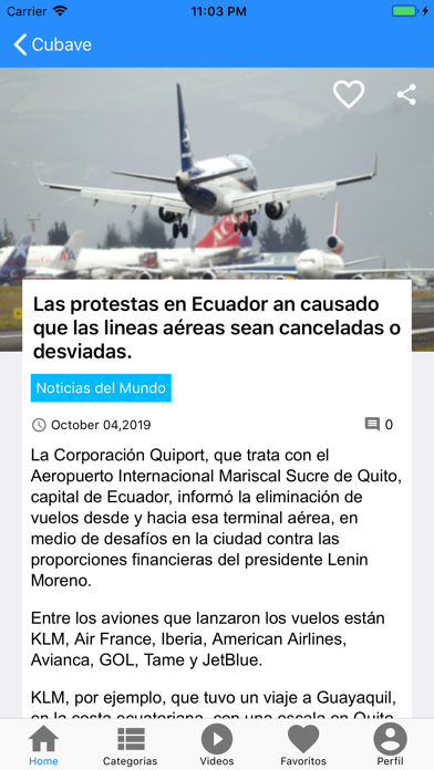Cubave Noticias es una aplicación desarrollada para la comunidad de habla hispana con la intención de mantenerles informados sobre todo lo que ocurre en nuestros países de Latino America, nos enfocamos en las areas de Política, Salud, Educación y Entretenimiento entre otras categorías. Nuestra meta no es solo informarlos, es también darles una herramienta con la cual pueden hacer escuchar su voz, su opinion y voto. Con Cubave puedes: - Comentar en artículos o noticias - Añadir a favoritos para leer después sin estar conectado a datos mobiles. - Compartir los artículos o noticias en las redes sociales Y Mas... "Estar educados e informados no es una obligación pero sí una oportunidad para crecer y fortalecer la mente"