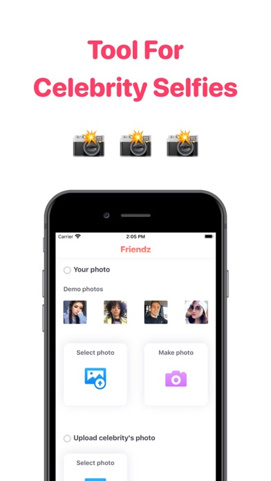 Friendz lets you meet your new virtual celebrity friends. Our app provides a unique solution for those who want to feel special and sociable. Friendz has two features, the first one is video calls and the second one is taking selfies with your virtual friends. Don't hesitate to try it out! Stay tuned for the weekly updates, we constantly add new features and content. If you would like to become the next celebrity virtual friend for others email us at [email protected] Legal Notice: - We do not claim any affiliation or endorsement - All of the content is unique and is used for the purpose of parody - If you have any questions don't hesitate to email us at [email protected] Payment and Subscription Information: • Payment will be charged to iTunes Account at confirmation of purchase • Subscription automatically renews unless auto-renew is turned off at least 24-hours before the end of the current period • An account will be charged for renewal within 24-hours prior to the end of the current period, and identify the cost of the renewal • Subscriptions may be managed by the user and auto-renewal may be turned off by going to the user's Account Settings after purchase • Any unused portion of a free trial period, if offered, will be forfeited when the user purchases a subscription to that publication, where applicable • Visit our Privacy Policy at https://sites.google.com/view/friendz-privacy • View our Terms of Service at https://sites.google.com/view/frienz-terms