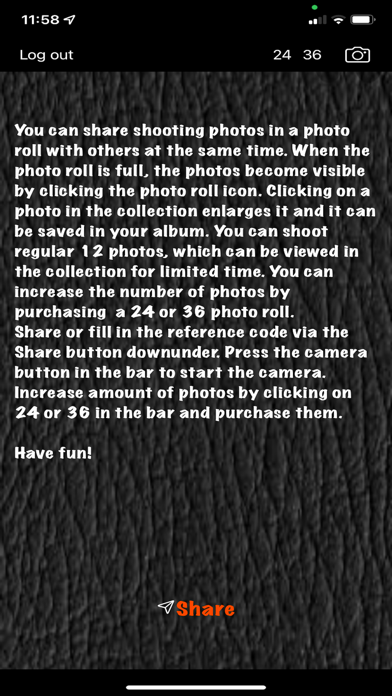 You can share shooting photos with others for the same collection at the same time. Nice if you are apart on holidays or at dance event or a marriage for instance! When the photo roll is full, the photos become visible by clicking the photo roll icon. Clicking on a photo in the collection enlarges it and it can be saved in your album. You can shoot regular 12 photos, which can be viewed in a collection for a limited time. You can increase the number of photos by purchasing a 24 or 36 photo roll. A notification tells you when the photos will be removed.
