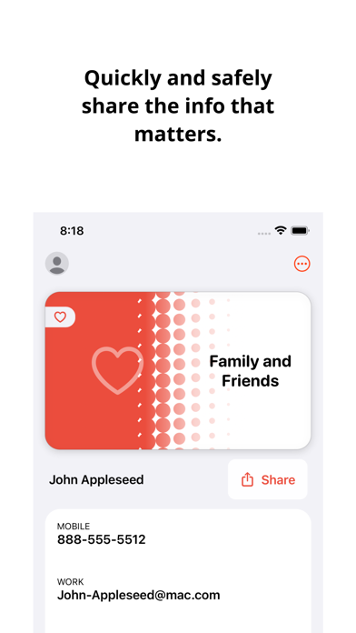 It's like a virtual business card, but for all of your contact information. Split out your contact information into smaller pieces that can be shared quickly and easily. Want to share your work information but not your personal phone number? Create a work card! Don't need to share your email with friends? Create a friends card! Only share the bits that matter to keep your information personal.