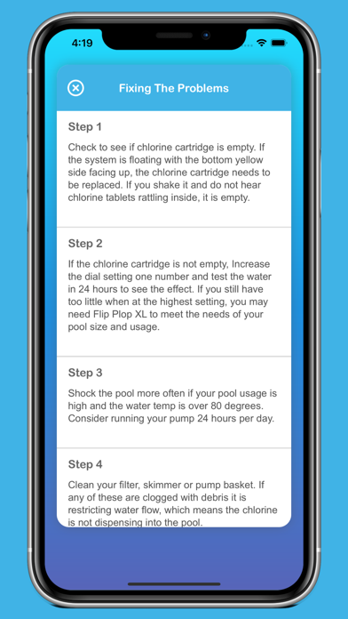 "Hey! Cool Pool Mobile Application The Hey! Cool Pool app will provide expert help with water testing to FlipPlop’s unique chlorine levels as well as troubleshooting and scheduling reminders for testing your water or replacing your products. - Gives clear step by step recommendations on test strip results - View testing history - Provide dosage recommendations - Solve pool problems - Instant and precise advice on correcting any water issues"
