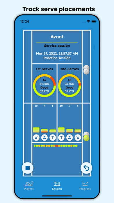 In Tennis, a serve is the most important shot in a point. A serve can decide the course of the point, and if it is a good serve, the serve itself can fetch the point. Players who have control on their serves have better control on the match. During practice sessions, players can plan to hit the six different zone targets with their serves. Tracking their placement outcomes and making the required changes will make the service practice more effective. AceMetrics helps players to track their serve placements in each zone. The graphs and charts indicate the strengths and weaknesses in the first and second serves on the target zones. It also helps players to plan their practice session and work on specific targets. These are the app features which help players, coaches and parents to help improve players' serves, 1. Multiple player profiles can be maintained 2. Service practice session of each player can be logged and tracked 3. During practice, the graphs and charts indicate the distribution of serves across zones and the outcome 4. View the details of all the practice sessions 5. Access all the practice session data across your iOS and iPadOS devices with iCloud Drive enabled for the app