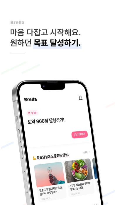 # 간단한 목표인데도 달성하기 힘들지 않으셨나요? Brella는 일상의 작은 루틴부터 버킷리스트까지! 나와의 약속, 목표를 이루는것을 도와주는 앱이에요. # 작은 목표라도 괜찮아요. 방 청소하기, 하루에 한번 스트레칭하기, 물 챙겨 마시기 등 나와 같은 목표를 가진 사람들과 서로 공유하고 동기부여 받으세요! # Brella 파티 만들기 1. 나의 목표를 이루기 위한 파티를 개설 하세요. 2. 목표를 이루기 위한 난이도를 선택하세요. 3. 사람들을 모집하고 소통하며 목표를 같이 이뤄요! 퀘스트를 성공하면 레벨이 오르고 다양한 배지를 받을 수 있어요. Brella를 통해 일상의 작은 변화를 경험 해 보세요. # Brella가 궁금하다면? 홈페이지 : www.brella.kr 인스타그램 : @brella.official # 고객 문의 앱 내 설정 -> 문의하기 # 선택 접근 권한 - 브렐라는 앱 사용에 반드시 필요한 개인정보를 최소한으로 요구 하고 있어요. 사진 : 목표 기록 및 프로필 사진 변경을 위해 사진첩 접근 권한이 필요해요.