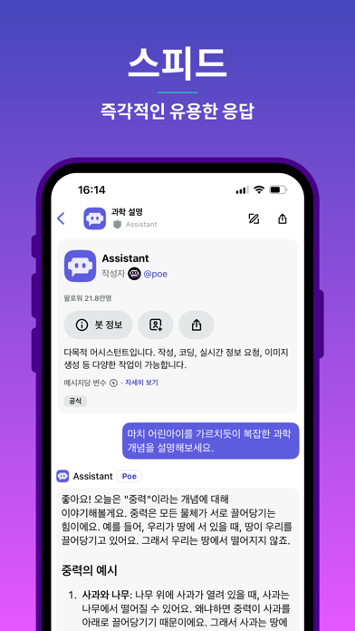 Poe는 최고의 AI를 한곳에서 만날 수 있는 플랫폼입니다. 원활한 대화, 더욱 향상된 생산성, 그리고 창의적인 콘텐츠 생성을 위해 설계되었습니다. 주요 특징: - 최신 AI 모델에 대한 빠르고 안정적인 액세스 - 기기 간 호환성 - 최첨단 멀티미디어 생성 - 단일 채팅에서의 모델 결합 및 비교 - 맞춤형 챗봇을 생성하는 고급 도구 최고의 AI 모델을 한 곳에서 Poe는 OpenAI의 o3 및 GPT-4.5, Anthropic의 Claude 3.7 Sonnet, Google의 Gemini 2.0과 같은 강력한 AI 모델과 Runway, ElevenLabs 등 다양한 멀티미디어 생성 모델을 통합합니다. 하나의 앱에서 AI 기술의 최첨단을 경험해 보세요. 한 번에 여러 봇과의 채팅 주요 AI 모델들의 응답을 비교하고 사용 사례에 맞게 다양한 봇을 원활하게 결합시켜 하나의 채팅에서 모두 처리할 수 있습니다. AI 기반 검색 엔진 고급 자연어 처리 및 웹 검색 기술로 관련성 높은 결과를 제공함으로써 필요한 정보를 더 빠르게 찾을 수 있습니다. 탁월한 이미지와 비디오를 즉각적으로 생성 FLUX1.1, Ideogram 2.0, Stable Diffusion 3.5, Veo 2, Runway, Hailuo, Dream Machine 등 최첨단 생성 모델로 여러분의 아이디어를 고품질 이미지나 비디오로 구현하세요. 맞춤형 봇 및 AI 퍼스털리티와 대화하기 100만 개 이상의 맞춤형 봇이 지속적으로 확장되는 생태계에 접근할 수 있어 새로운 언어 또는 다양한 주제에 대한 학습, PDF 및 이미지 같은 업로드된 파일과의 직접적인 대화, 최신 세계 뉴스의 웹 검색, 좋아하는 캐릭터들과의 자연스러운 대화 등이 가능합니다. 나만의 AI 봇 생성 및 공유 1분 이내에 학습 계획 생성, Spotify 플레이리스트 구성, Python 코드 실행 등 상상할 수 있는 모든 작업을 수행하는 맞춤형 챗봇을 만들어 보세요. 사용자에게 더 독특한 경험을 제공하는 맞춤형 지식 베이스를 추가할 수 있습니다. 생성한 AI 챗봇을 Poe 사용자들과 즉시 공유하세요! Poe는 사용자 친화적인 인터페이스를 통해 원활한 AI 경험을 제공합니다. 지금 Poe를 다운로드하고 AI의 미래를 만나보세요. Poe에는 무료 봇과 구독 봇이 모두 포함되어 있습니다. 구독 결제는 구매 확인 시 Apple ID로 청구됩니다. 구독은 현재 기간 종료 24시간 전까지 취소하지 않으면 자동으로 갱신됩니다. 갱신 비용은 현재 기간 종료 24시간 전 이내에 사용자 계정에 청구됩니다. 사용자는 구독을 관리할 수 있으며, 구매 후 '구독 관리' 페이지에서 자동 갱신 옵션을 끌 수 있습니다. 무료 체험 기간의 미사용 부분은 사용자가 구독을 구매하면 상실되며, 해당되는 경우에만 적용됩니다. 구독은 동일한 비용으로 갱신됩니다. Poe를 사용함으로써 귀하는 당사의 개인정보 보호정책 및 이용 약관을 읽고, 인지하며, 동의한 것으로 간주됩니다. 개인정보 보호정책: https://poe.com/privacy 서비스 약관: https://poe.com/tos