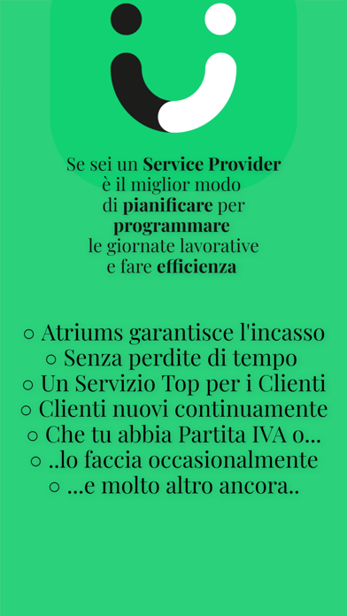 Atriums è il marketplace che consente di ordinare all'instante servizi professionali per ogni tua esigenza. Hai bisogno di aiuto per le pulizie di casa? Per il giardino? Per il tuo appartamento in affitto? Un idraulico? Sei un professionista o lavori occasionalmente? Atriums è il posto giusto per te. 01. CERCA I SERVIZI Cercai servizi di tuo interesse nella tua zona, che sia la un tuo Atriums (casa di tutti i giorni, casa al mare, il tuo ufficio) o una locazione temporanea. Atriums rileva in autonomia la tua posizione nel mondo, in alternativa puoi ricercarne una sulla mappa. Tutti i servizi sono organizzati in categorie, puoi scegliere quello di tuo interesse, al prezzo indicato e ritenuto il più affidabile. 02. ORDINA I SERVIZI Ordina il servizio scelto, definendo la modalità di erogazione del servizio (at home, in delivery piuttosto che un servizio ad ore o a quantità) tra quelli residisponibili dal Service Provider, il giorno e l’ora di esecuzione del servizio oltre all’eventuale ricorrenza se desiderata, le quantità dove richiesto econferma l’acquisto. Finito! Al resto ci penserà il service Provider che hai scelto. 03. RICEVI IL SERVIZIO Attendi semplicemente che il Service Provider si organizzi per l’esecuzione del servizio nelle modalità richieste e concordate. Una chat tra il Service Provider e il Cliente verrà utilizzate per una dialogo riguardo l’ordine eseguito. Poi? Semplice anche il delivery del servizio ordinato. CHAT Il Service Provider si terrà in contatto continuo con il cliente, confermando il ricevimento dell’ordine e rassicurandolo sul rispetto delle modalità di esecuzione concordate, dialogando attraverso la chat di Atriums per qualsiasi questione riguardo il servizio. Alcune ore prima dell’avvio alcuni messaggi di remind verranno inviati in automatico a Service Provider e Cliente. PARTI Prima dell’avvio del Servizio, il Service Provider avrà già ottenuto da Atriums tutte le informazioni utili a raggiungere il tuo Atrium, tu potrai eventualmente aiutarlo a raggiungere la destinazione se necessario. ESEGUI Il Service Provider avvierà quindi il servizio confermandone il check-in di avvio e il check-out una volta terminato e potrà concordare nuovi servizi con te. Infine? E’ andato tutto bene? CONCLUDI Una volta terminato il servizio, Atriums attiva tutte le procedure amministrative per completare gli aspetti formali del servizio attraverso i passaggi successivi (Paga e fornisci recensione). Tutto è automatizzato quindi, il cliente e il Service Provider devono unicamente completare le azioni indicate da Atriums. PAGA Tutte le transazioni eseguite in Atriums sono garantite dal processo e come cliente sei assolutamente garantito del buon fine sia del servizio ordinato che della corretta esecuzione del pagamento a cui pensa Atriums. Non devi nulla al Service Provider, ci pensa Atriums. Non ordinare servizi fuori da Atriums se vuoi rimanere protetto da frodi, raggiri e servizi non all’altezza delle tue aspettative. RECENSISCI Se tutto è andato bene, Atriums avrà quindi eseguito pagamento concordato al Service Provider. Finito! Lascia la tua review a 5 stelle se sei soddisfatto o fino a 1 stella con commenti se sei scontento. Per il Service Provider è importante ottenere 5 stelle e dare il massimo, le review sono la prima cosa che tutti i clienti guardano prima di scegliere un Service Provider. Se ci sono invece contestazioni potrai aprire subito un claim in Atriums.