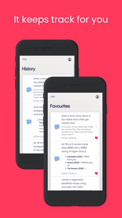 Askify is an easy to use App that lets you access the best of artificial intelligence (AI) with your phone or browser. You can quickly get answers to any questions, have things written for you in seconds (social posts, recipes, full length articles, emails, stories, even poetry), automate tasks, and be fully entertained in a new way. Here are a few examples of what Askify can - try it out with while it is still free: * Answer any question, but answer it really well * Write songs, poetry, fiction and fact * Entertain you - "Ask me a hard science trivia question" * Create recipes, no matter your taste or requirements - "Create a breakfast recipe, lots of banana, no carbs, that I can eat in the car" * Generally blow your mind! It can seriously do so much - your imagination is the limit, and even then, it can help you with that. Try "List 10 things I can ask you when I am bored" and see the results. Privacy Policy: https://askify.ai/privacy Terms of Use: https://www.apple.com/legal/internet-services/itunes/dev/stdeula