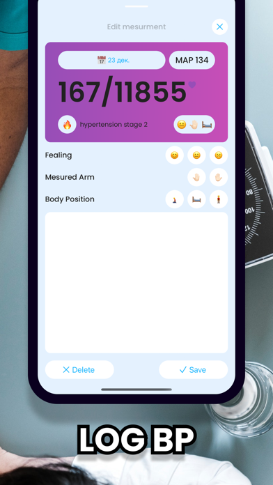 This is BP Diary app, It don't measure your blood pressure. Not using any device sensors and not connecting to any external device that can measure bp. You need to log your blood pressure and see charts over selected period. This is Diary app with charts and export pdf documents. All data is private and never live your devices, the app not use any network connection. Once you delete app your diary data will be deleted forever. Tack, log your blood pressure. Nice UI and interface. Support Health kit synchronization. Automated analitics calculation: View MAP analitics and trends over selected time period. View systolic blood pressure "Sys" and diastolic blood pressure "Dia" trends over selected period View blood pressure "BP" overview trends over selected period. View mood, body position, arm and influance on your BP trends. Export PDF document and share to anyone