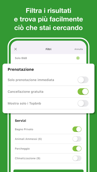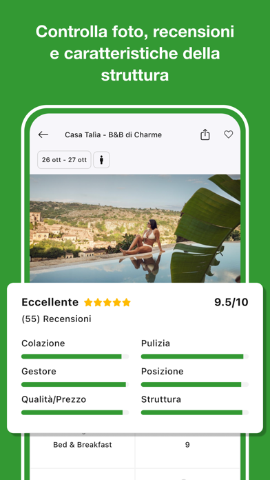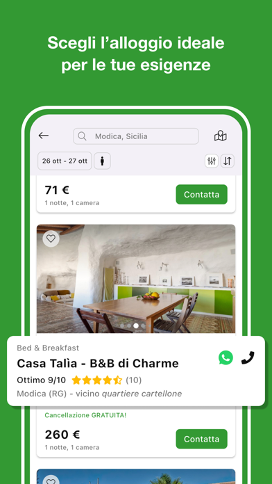 Dormire in tutta Italia ai prezzi più convenienti in assoluto non è mai stato così facile. Scarica l'app di Bed-and-Breakfast.it e scegli tra migliaia di B&B, affittacamere, agriturismi, case vacanza e piccoli hotel. NESSUNA COMMISSIONE SULLE PRENOTAZIONI Non carichiamo né i gestori né i viaggiatori di alcuna commissione sulle camere prenotate, per questo i nostri prezzi sono i più convenienti in assoluto. CHATTA DIRETTAMENTE CON I GESTORI Puoi contattare i gestori tramite modulo o WhatsApp, velocemente e con un solo tap. SENZA PENALI, SENZA PENSIERI Sono tantissimi i nostri B&B che permettono la cancellazione gratuita di una prenotazione. Assicurati il prezzo di oggi per la tua vacanza. PRENOTA DIRETTAMENTE Non vuoi perderti l'offerta che hai appena trovato? Centinaia di alloggi consentono di prenotare immediatamente, senza dover sondare la disponibilità della struttura. LA STRUTTURA PERFETTA PER TE Ordina per prezzo o recensioni, filtra gli alloggi per caratteristiche o posizione. Trovare la tua struttura ideale è facilissimo. IL TUO PERSONAL ASSISTANT Usa il nostro nuovissimo widget per avere tutte le informazioni sul tuo viaggio, consigli e ispirazioni direttamente sulla home del tuo dispositivo.